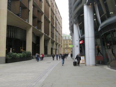 Into Mansion House and the Royal Exchange. Then along Threadneedle Street and the Bank of England. Further along a short diversion into St Helen's Place with the church and the first view of the Gherkin behind.
