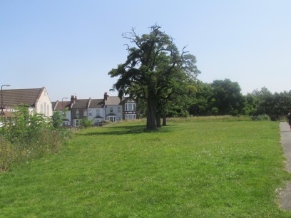 Eventually after passing a bowling green and then a busy road junction on the A206 I reached Plumstead Cemetery with a magnificant entrance. After that East Wickham Open Space, a former Council tip now made into a public open area. The summit of Shooters Hill appears in the distance. I took a wrong fork on the tracks here and ended up on the south end of the Space. A friendly resident pointed me in the right direction, and the route then followed urban streets for a while.