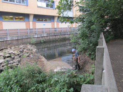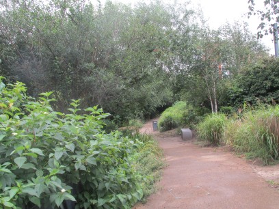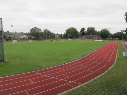 A lengthy stretch of Ladywell Road took me to Ladywell station, another suggested break point, to rejoin the Ravensbourne in Ladywell Fields. A choice of paths either side of the river. The man here was clearing loads of mud from the riverbed with his spade, commented that this work all relied on volunteers. The path then crosses the railway line again via a large many stage footbridge. At the top is a view of this magnificent running track, part of Ladywell Arena.