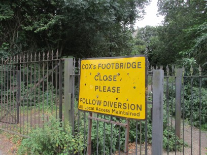 I had established beforehand that the old bridge over the disused Crystal Palace and South Junction railway was closed and the Green London Way route down the east side of the railway cutting was not possible. So based on the advertised diversions I continued a little further along the South Circular to the next junction and picked up the Dulwich branch of the Green Chain walk there, which took me down to the bridge where I picked up the original route. These sections also form Cox Walk, the Grove which is a landmark on the Cox Walk is no longer a pretty sight. First sign of the closure ahead.
