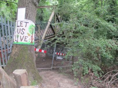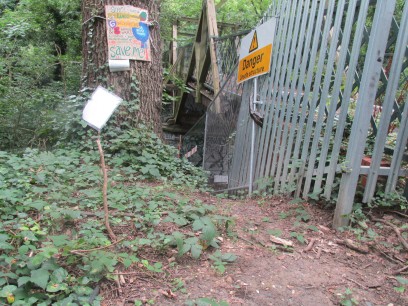 So after a pleasant walk through Sydenham Hill Wood I reached the bridge. This has long been neglected and is now clearly dangerous and it was planned to be repaired. But the council decided in order to carry out the work a couple of oak trees had to felled to allow access. Objections came and late last year protesters camped by the bridge to stop the workers felling them. This impasse continues to this day and all the time this necessary crossing remains closed.