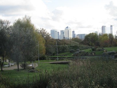 Continuing on section 10 we first rejoin the canal but the walk diverts through Mile End Park, an attractive park in several sections to the side of the Regent's with Canary Wharf not far away.