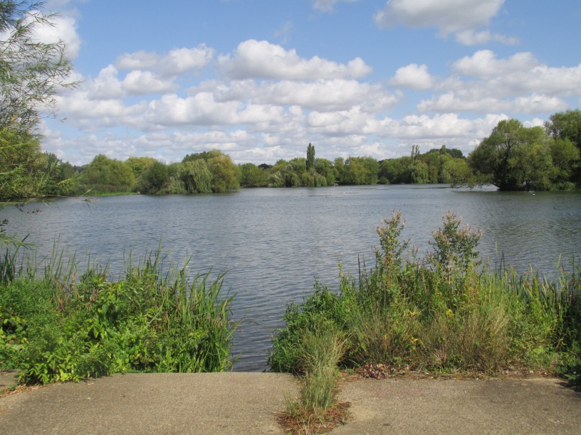 Now we reach one of the highlights of this section. This lake, which seems not to have a name, within the Roding Valley Meadow Nature Reserve, was formed in the area they quarried the gravel for the adjacent M11 motorway. It is huge and the loop goes round two sides before crossing a bridge and following the River Roding. Quite pleasant and very popular with walkers.