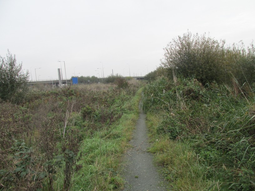 A bit of somewhat overgrown path leading down to the Thames (A13 in distance).