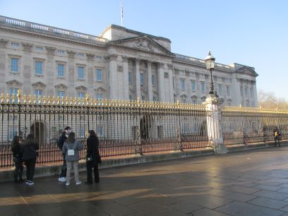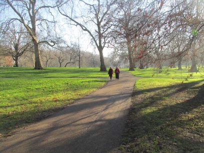 Across Picadilly and into Green Park. The river flows straight through here and evidence can be seen of the valley in the undulations. Then it flows directly past Buckingham Palace right in front of where the few tourists are gathered.