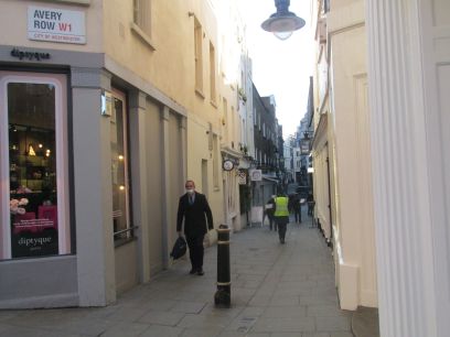The route of the river is picked up again lower down in South Molton Lane following on into Avery Row built in 1720 by the bricklayer Henry Avery over the newly culverted Tyburn. We are now in Mayfair. This is really in the river valley. The route ahead was blocked off so a small diversion was needed to reach Bourdon Street.