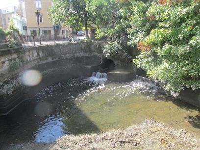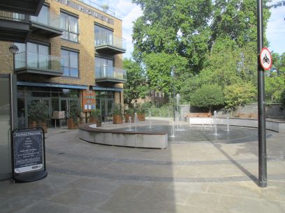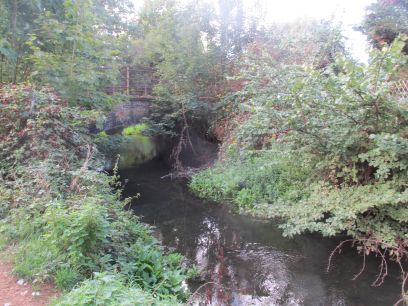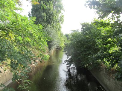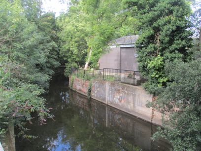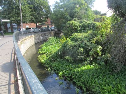 The river runs alongside Riverside Walk where two mills and a moated house used to be. Then it bends round to the east and flows through St John's Park.