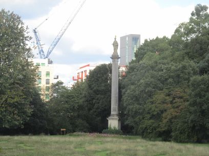 The other end of the lake and woodlands and Flora's Column on Flora's Lawn.