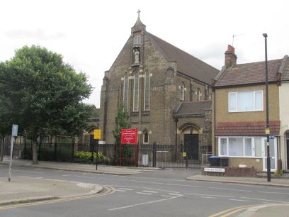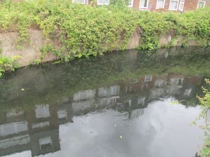 The brook emerging from under the North Circular. Now follows a section parallel to the busy road and then through residential areas. The church of St John the Baptist is passed.