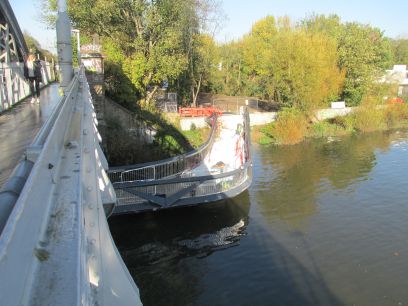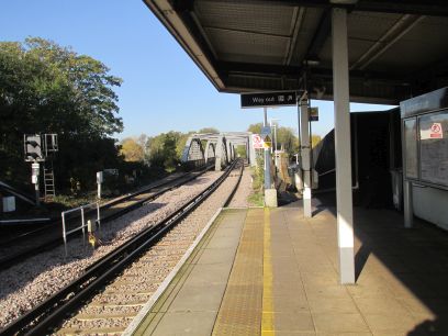 The walk starts at Barnes Bridge station and immediately crosses the railway bridge there directly off the platform. Barnes Bridge is one of only three railway bridges in London that can be crossed on foot. At the far end is seen the new footbridge underneath the bridge which when completed avoids a lengthy and not very interesting diversion of the Thames path.