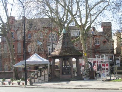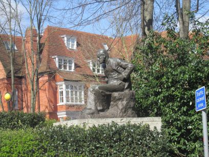 The route follows the rough route of the buried river through suburban streets towards Swiss Cottage which has some very nice houses. A prominent statue of Sigmund Freud is passed, he lived near here until his death. Nearby is Palmer's Fountain remembering Samuel Palmer, one of the founders of Huntley and Palmers. His London residence Palmers Lodge is opposite. The fountain has become the base for Harry's Flowers who seemed looking for customers.