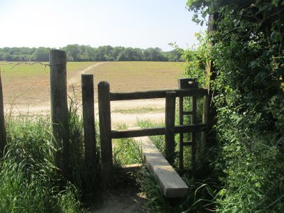 After again crossing the busy Rook Lane, then along a field the other side, there is a short diversion through the wooded Alderstead Heath. Then a path across an enormous field at the far end of which was a stile which I rather struggled with but eventually got across.