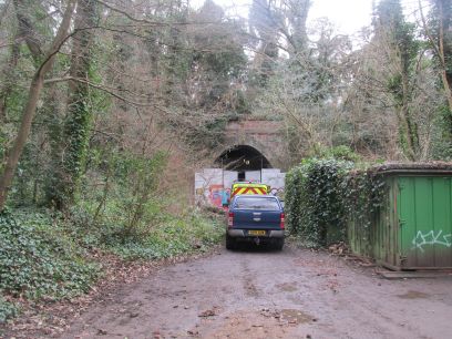 Shortly after the bridge the path and Green Chain walk drops down via steps to the bed of the railway, of which no sign remains. Then the northern portal of Crescent Wood tunnel where some work seems to be going on. By here is Sydenham Hill Wood Nature Reserve.