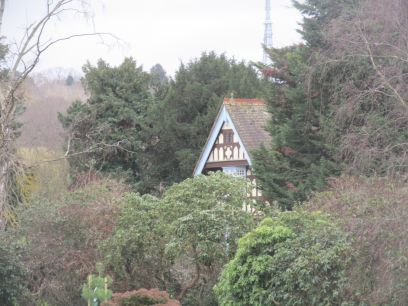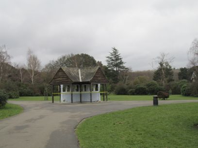 A wooden shelter and then a view of the lodge at Roseberry Gate through the trees along with the Crystal Palace mast in the distance.