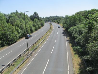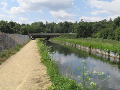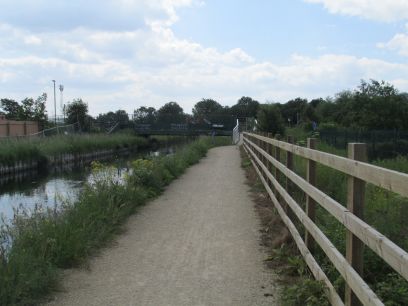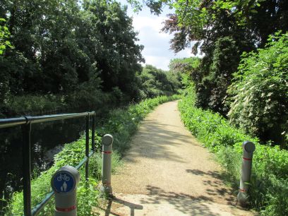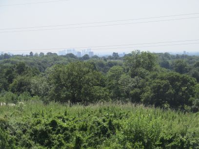 The roar of the motorway is crossed via a huge footbridge with steep steps and seemed a big expense for the occasional walker. From the top there is a good view back to central London, the Shard and Canary Wharf.