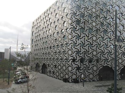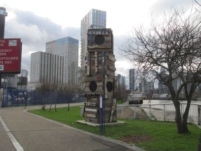 By the Quantum Cloud and a reed bed I left the towpath and followed a raised walkway towards North Greenwich station where I caught the train home. The Ravensbourne building continues the art theme with it being clad as a tri-coloured jigsaw.