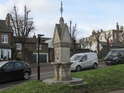 The Victorian water fountain sits at the corner of the heath. Nearby is All Saints church built in 1857.