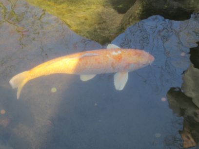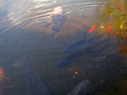 The ornamental fish are huge and there was a crowd of people on the narrow bridge there standing and staring.