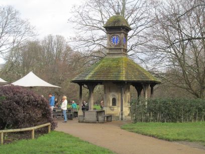 Out of the park and along Holland Walk to reach Holland Park Avenue. Then a stretch through suburban streets, passing St George's Church and the Russian Embassy to arrive at Kensington Gardens. By the Diana Memorial Playground is Time Flies, a tall shelter with clock, and the busy Broadwalk Cafe.