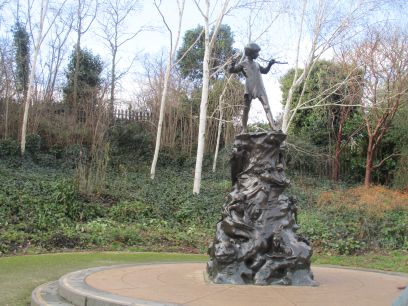 Another view across the Long Water. Then the Italian Water Gardens and Queen Anne's Alcove appear and I passed the statue of Peter Pan commissioned by Sir George Frampton and erected in 1912. A steady stream of visitors wanting to be photographed beside it, I had to wait to take my photograph.