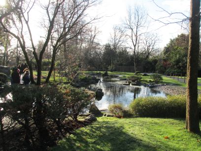 A statue of a walking man adorns the Yucca Lawn. Then the Fukushima Garden.