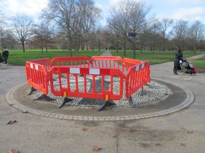 Here I left Kensington Gardens via the Magazine Gate, passing the former Magazine which is now the Serpentine Stickler Gallery and the remains of the Middle Bastion. Hyde Park is entered and a memorial to the naturalist W H Hudson. The path continues past the Park Police Station and eventually reaches The Reformers Tree, a former tree remembered in black and white cobbles and signpost arrows around the park, currently fenced off which somewhat spoils it appearance.