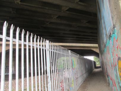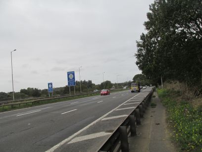 Now a zig zag route to cross the A2 and the railway line where the path goes along the side of the A2 for a short stretch then a dog legged path to cross them both.