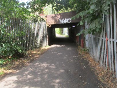After some paths across open country I reached the somewhat hidden underpass under the railway. Then the Wandle flows past the Havelock allotments.