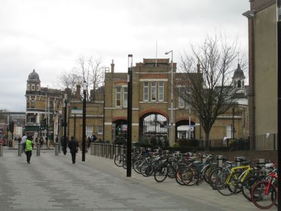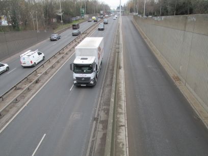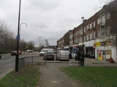 The busy A2 Rochester Way Relief Road has to be crossed via a pedestrian bridge. On the opposite side a small shopping parade, Kidbrooke Parade.