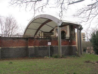 I started the walk at Woolwich Elizabeth Line station. However I forgot that those trains now run through and having dashed to get on the train sitting at the platform at Tottenham Road realisd that being a Shenfield train it wouldn't take me to Woolwich. Off at Farringdon for another try, arriving at my start around 10.45. Across the square, past the Royal Arsenal Gatehouse, then through the streets of Woolwich to reach the derelict Garrison Church of St George which was destroyed by a V1 in 1944.