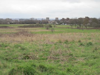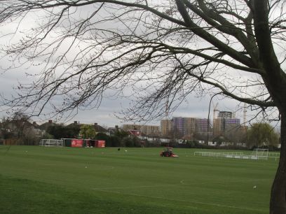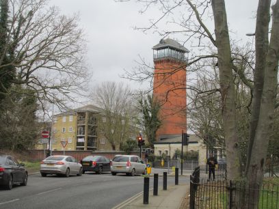 Crossing the busy Shooters Hill Road to the nearby London Water Tower. This former water tower served the former Brook Hospital but now is housing. Then a stretch of suburban roads including the unusual Kellaway Road which is divided into several sections with grass areas between them. This runs along the grounds of Kidbrooke Playing Fields with some good views across to southern London.