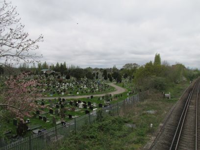 Crossing the railway line the large Hither Green Cemetery is seen. Railway Children Walk continues the other side.