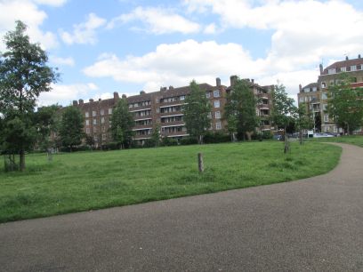 Then a confusing sequence of estate roads to eventually reach Surrey Square Park. All these Heygate estate parks looked pretty similar. But not very many more roads until the big one is reached, Burgess Park with its large lake and real countryside.