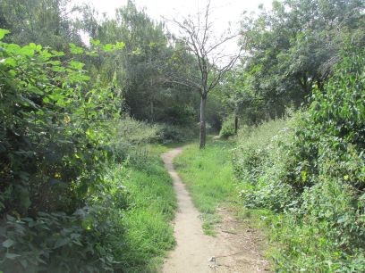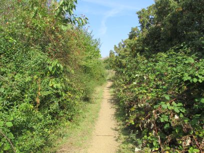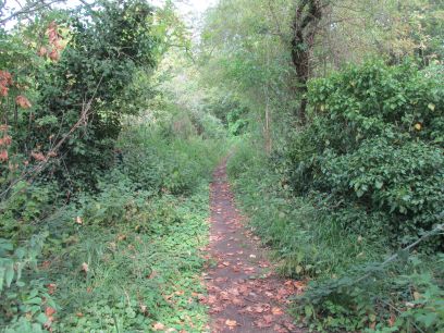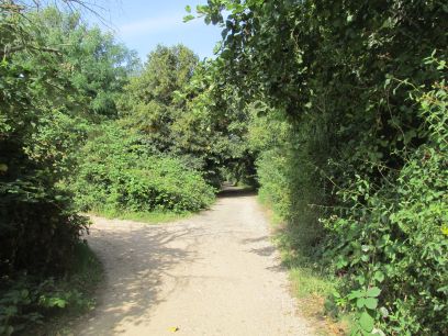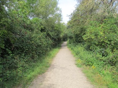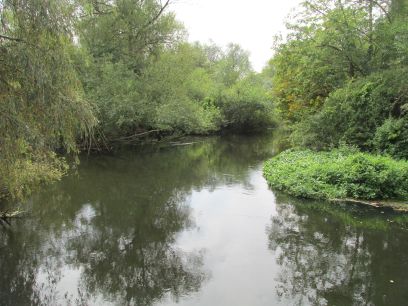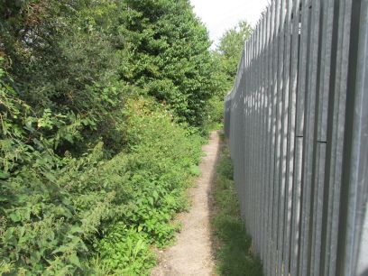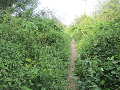 The next section continues beside the Colne but for a while there is a high intimidating fence with industrial units the other side. Eventually back into open country, the river is largely hidden though behind the vegetation.