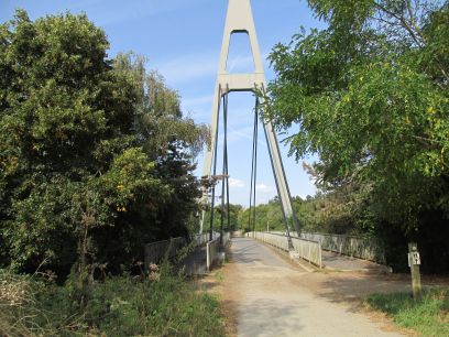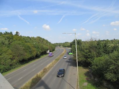 A large bridge supported by a single pillar takes the path over the busy Stockley Road.