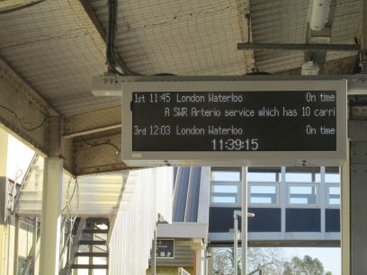 I decided to join the train at Staines on its return journey to Waterloo which meant catching the 1103 train from my local station. There was an immediate issue in that when I arrived at the station the 1033 was still sitting there as there was a precarious tree by the line. Luckily it soon moved off and my train arrived on time and got me to Staines in good time. A few other train enthusiasts waiting, cameras ready. SWR call the train the 'Arterio', whatever that means, and the departure board highlighted this. The train arrived bang on time. Since it followed a normal Windsor to Waterloo train by just a few minutes most who boarded were enthusiasts!