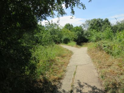 A path with some very steep steps leads underneath the Docklands Light Railway into Mudchute Park, an extensive area of parkland.