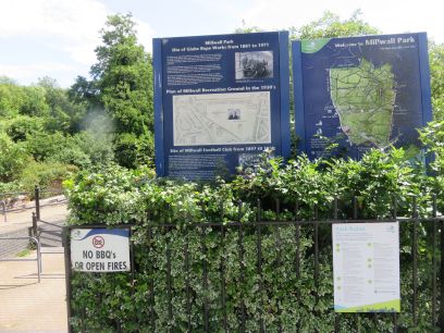 At the end of Mudchute Park more steps lead to Millwall Park, the home of Millwall football club until 1910, now parkland and sports facilities.