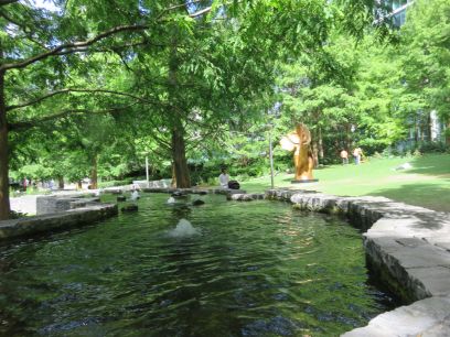 The Fortuna sculpture then the entrance to the Jubilee line at the opposite end of the park.