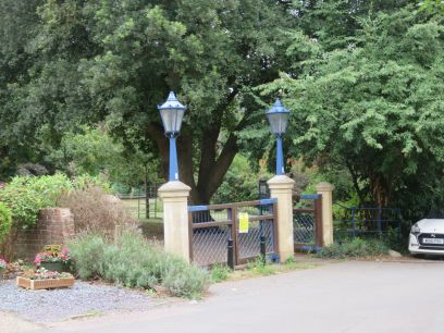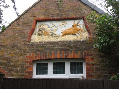 At the corner of Upton Road a house has a frieze depicting the goddess Diana hunting a stag. Then into Herschel Park with ornate lamps on its entrance gate.