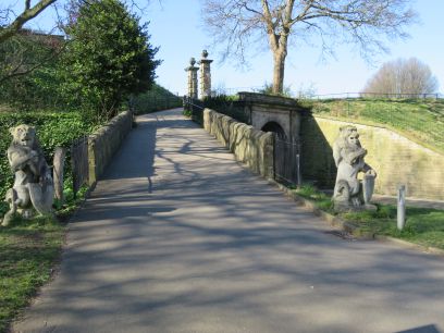 Within the grounds a memorial to Captain Albert Ball VC, a local WW1 pilot. Lions guard the entrance to the mansion.
