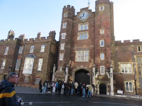 St James's Palace with a large group of tourists by the gatehouse with the Chapel Royal adjacent.