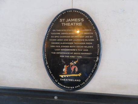 A courtyard behind the Berry Bros wine merchants. Then a plaque commemorating the St James's Theatre demolished in 1957. A short walk took me back to Piccadilly Circus and the end of the walk.
