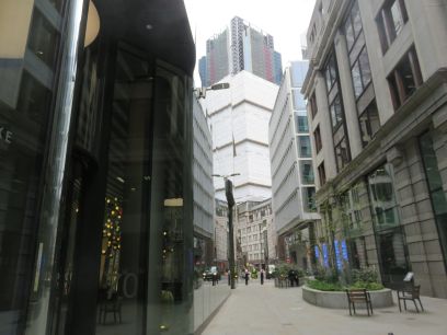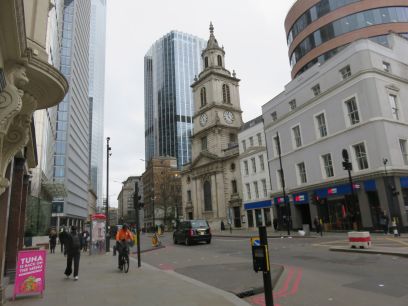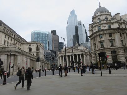 Into Mansion House and the Royal Exchange. Then along Threadneedle Street and the Bank of England. Further along a short diversion into St Helen's Place with the church and the first view of the Gherkin behind.