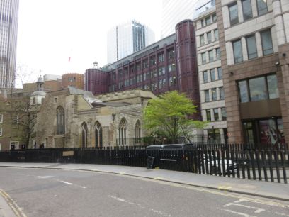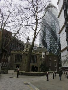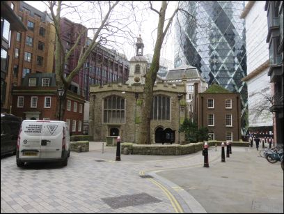Another view of the Gherkin and then into the churchyard of St Botolph-without-Bishopsgate and the former church school.